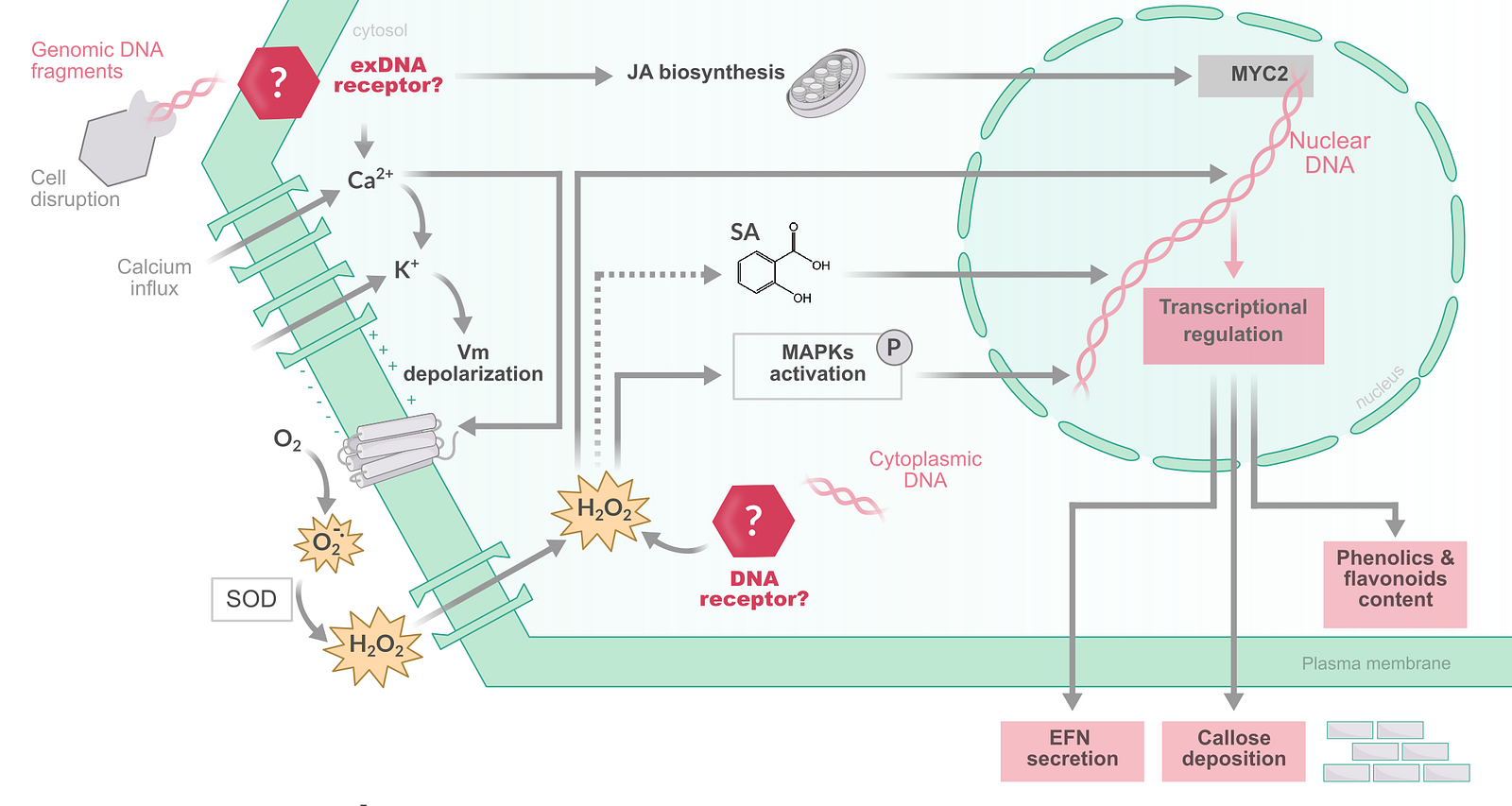 By combining molecular biology, biochemistry, and omics approaches, we aim to uncover the mechanisms that control DAMP perception and signalling. Our work has revealed extracellular self-DNA as a novel DAMP that elicits immune responses, positioning self-recognition as a central component of plant immunity. Ultimately, our goal is to identify the receptors and signalling networks mediating DAMP perception, providing a mechanistic framework to harness these pathways for sustainable crop protection.