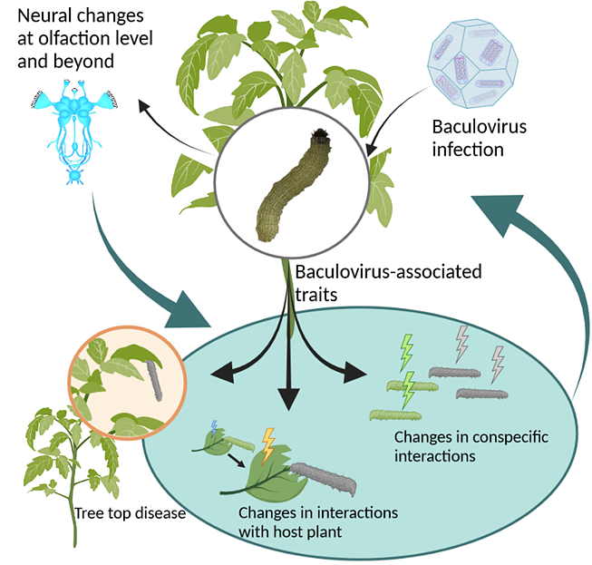Our proposal will explore how viruses can manipulate animal behaviour, and how this in turn leads to increased viral success. We will do so by using as a model a three component ecological system composed of a specialist baculovirus (BV) that specifically infects the caterpillars of the moth Spodoptera exigua and the tomato plant where these later feed. Core to understanding how virus manipulate behaviour are three questions that will guide our proposal. Q1 - What is the cellular substrate manipulated by viruses? Q2 - What are the molecular mechanisms mediating those changes? Q3 - How do these changes interact with ecological factors to culminate in a behavioural manipulation that ensures maximal viral spread? Our model system has key features that will enable us to address these questions, including the ability to genetically manipulate all three ends; the virus (BV), the host (S. exigua) and the ecological setting (tomato plants). Addressing these questions requires a uniquely multidisciplinary approach such as the one proposed by our team formed by an insect virologist (CC), an insect neuroscientist (LPG), a plant geneticist and physiologist (JFG) and an ecologist (FY).